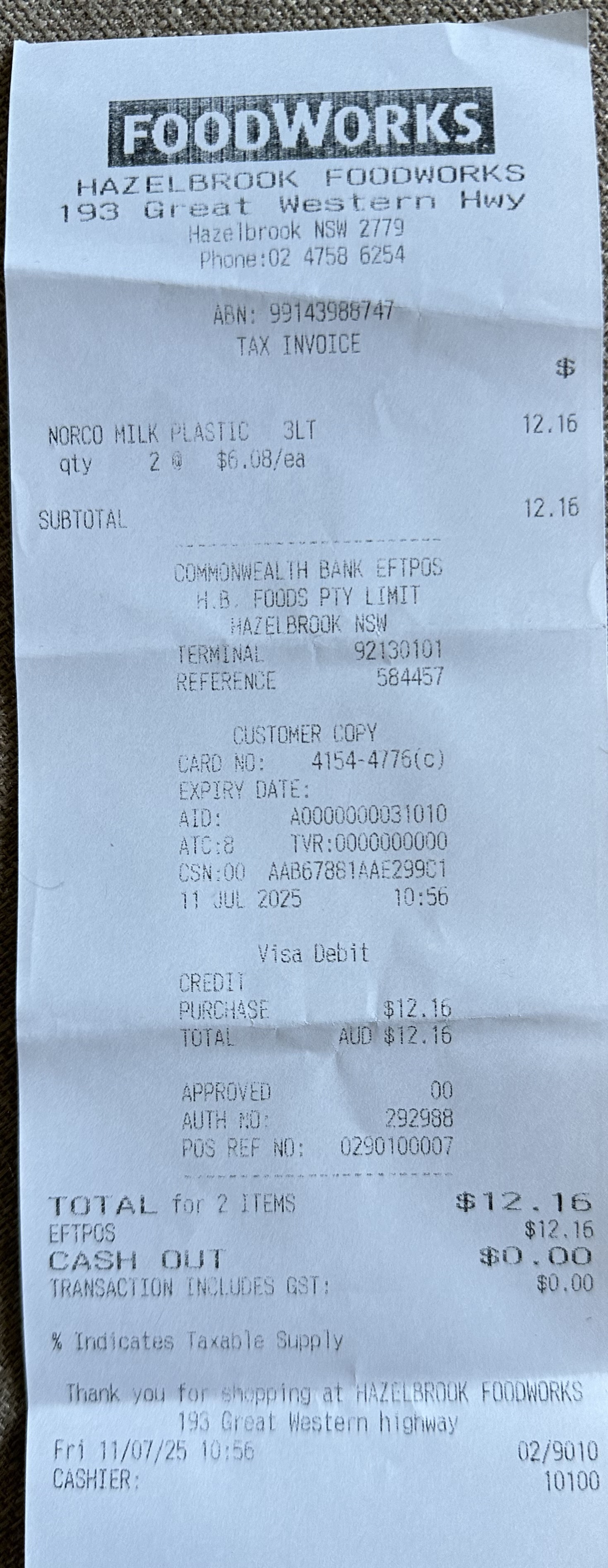 2025-07-11 Milk Foodworks Food $12.16 Shared Household πŸ“Ž ✏️
