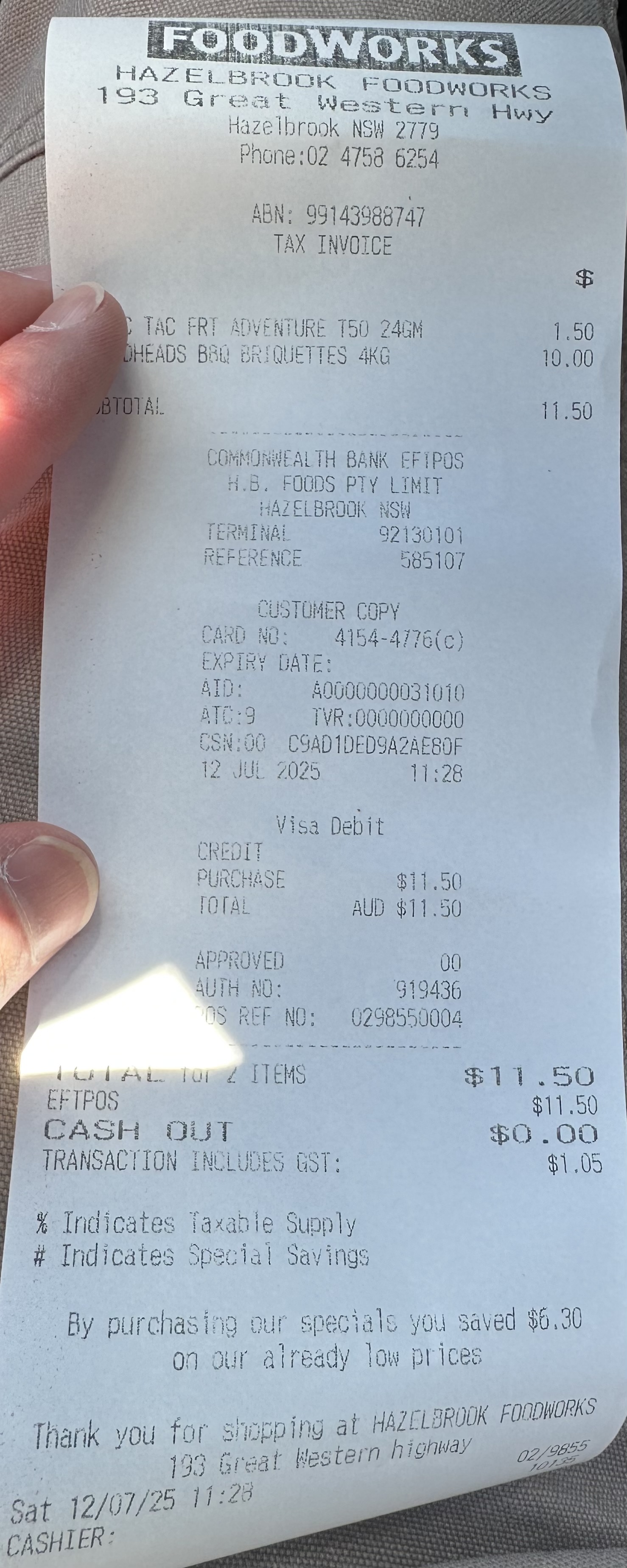 2025-07-12 Groceries Bricketts for smoker Food $11.50 Shared Household πŸ“Ž ✏️