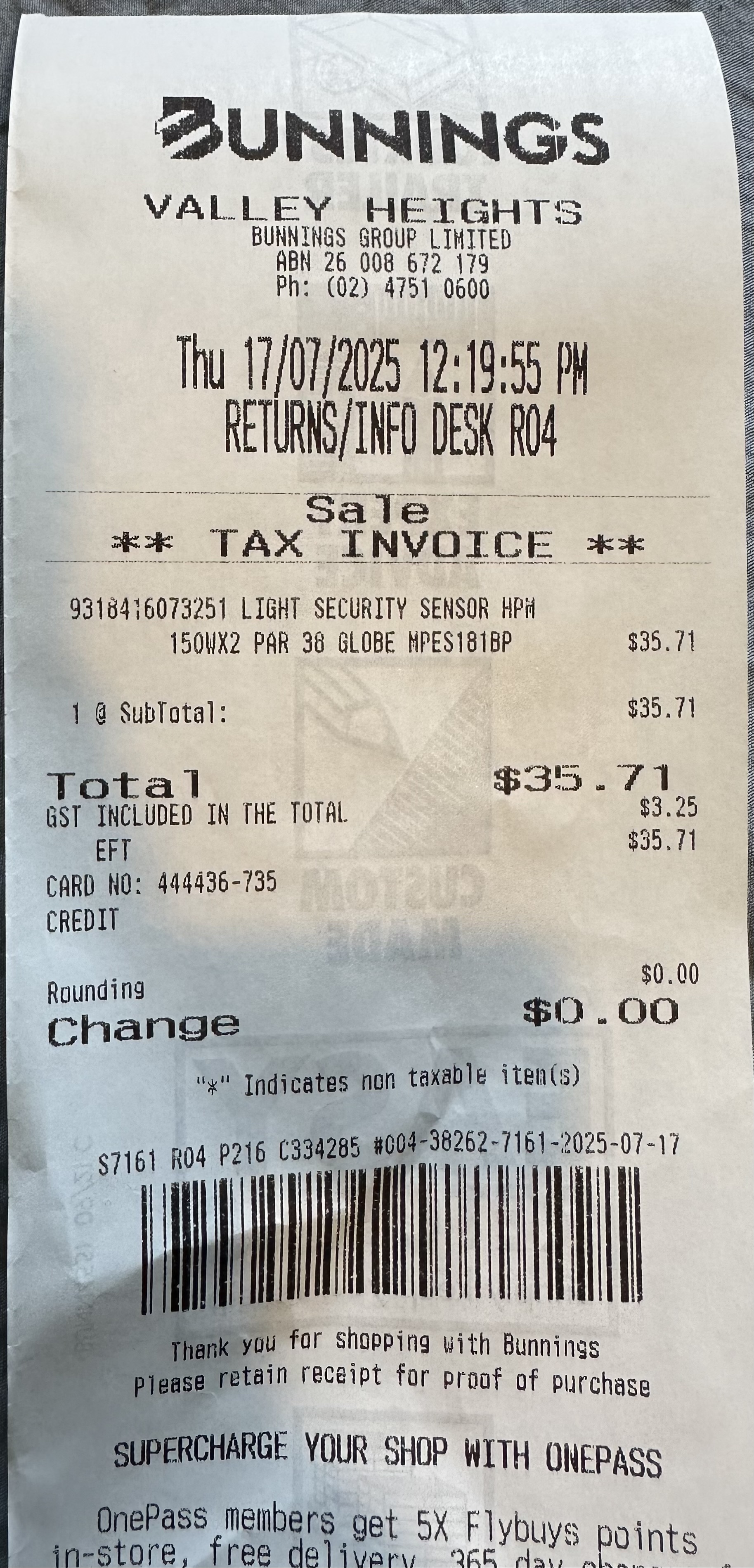 2025-07-17 Sensor Light Bunnings Utilities $35.71 Shared Household πŸ“Ž ✏️