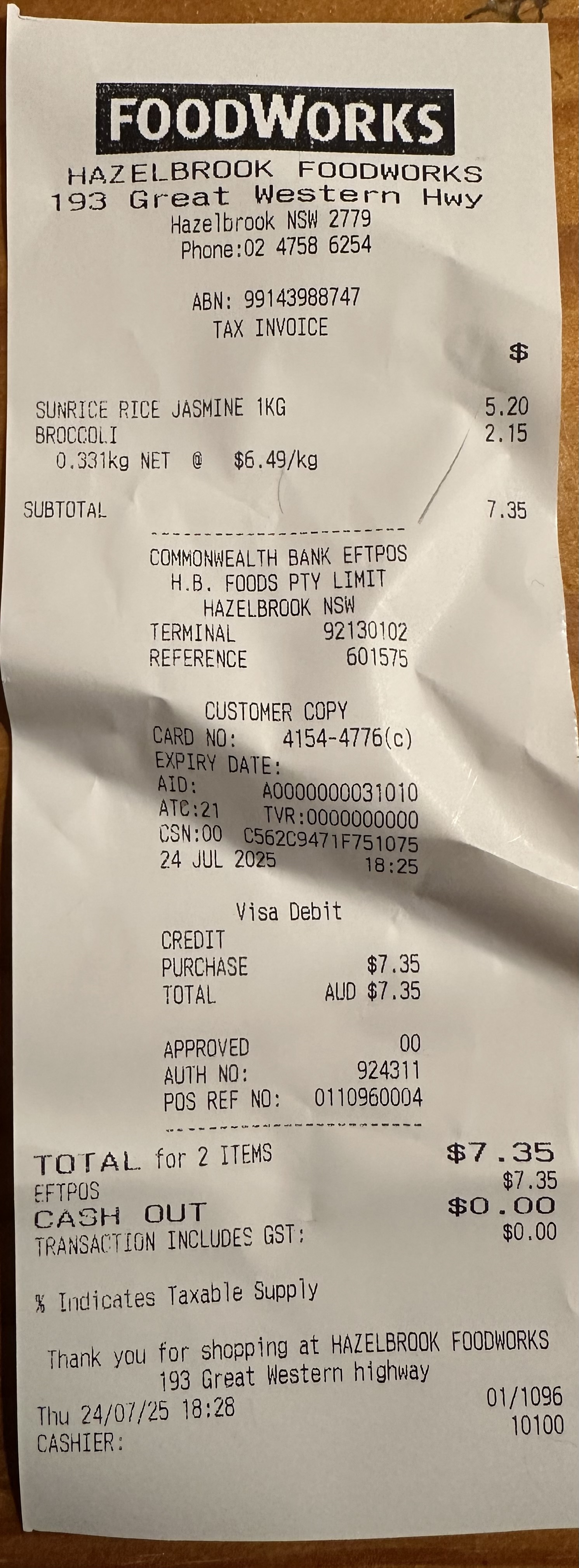 2025-07-24 Groceries Foodworks Food $7.35 Shared Household πŸ“Ž ✏️